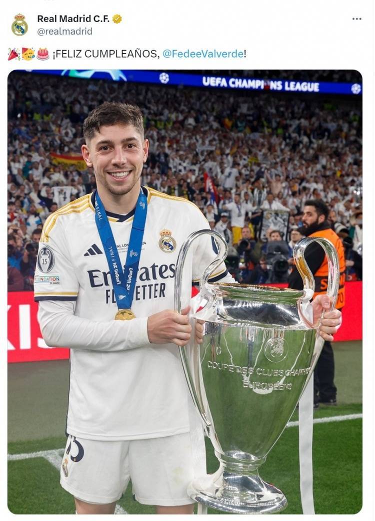 皇马官方社媒晒出巴尔韦德与欧冠奖杯的合照,配文:“生日快乐,巴尔韦德!”